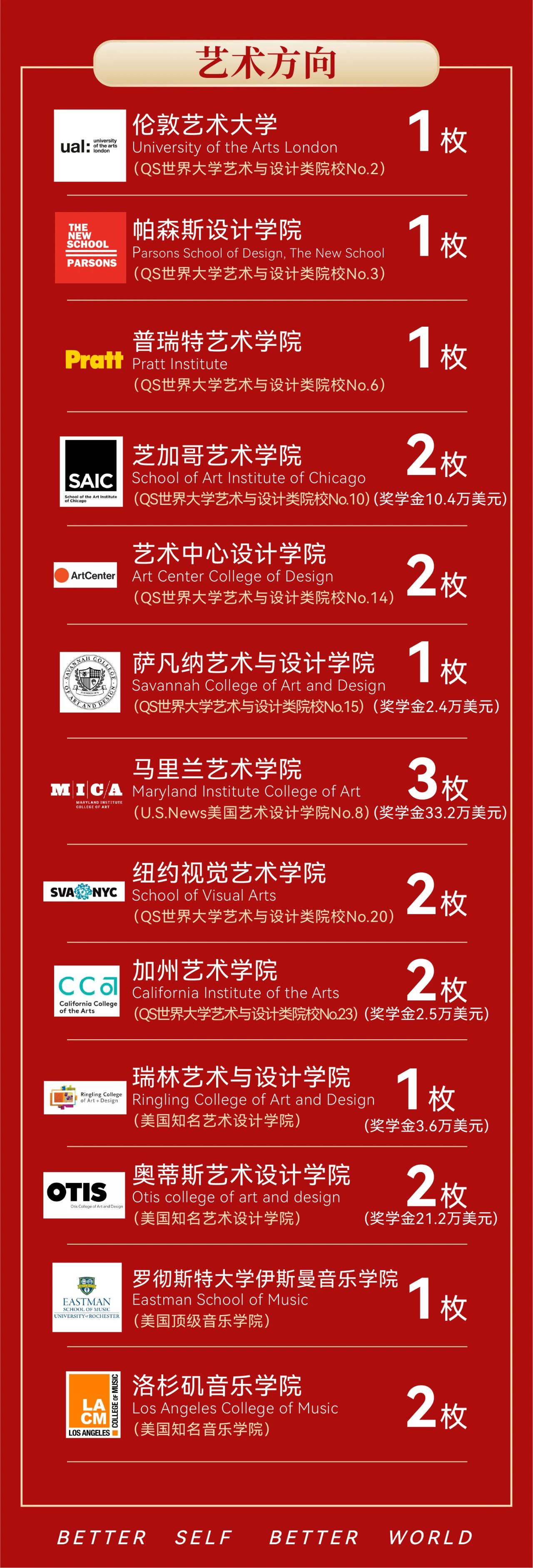 艺术方向:艺术设计类院校全球本科第一的伦敦艺术学院、美国顶级艺术学院帕森斯设计学院、普瑞特艺术学院,以及音乐殿堂罗切斯特大学伊斯曼音乐学院、洛杉矶音乐学院等艺术院校纷纷为新哲学子发来奖学金录取!